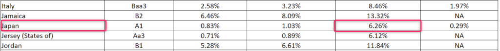 ダモダラン教授のホームページから取得できる各国のエクイティリスクプレミアムは米国のマーケットを基準にして作成されています。そのため米国以外のエクイティリスクプレミアムを使用する場合、そのままこの数値を利用することは厳密には正しくありません。但し、上記したようなWACCの目線感を知りたいという趣旨であれば、当該ホームページの数値をそのまま使用しても問題ないでしょう。