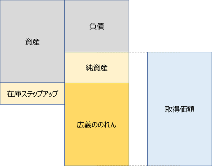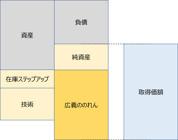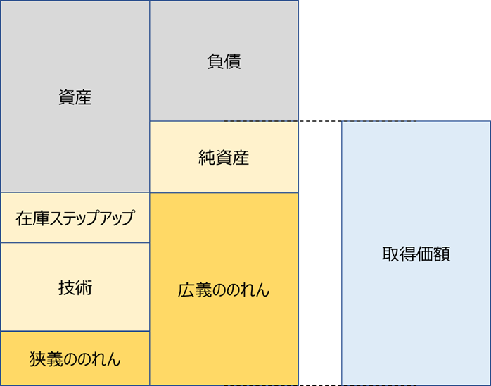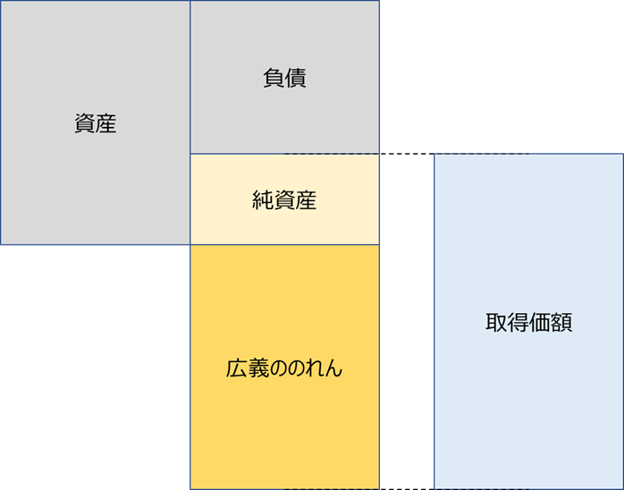 広義ののれんが、取得価額と純資産の差額であることは上述のとおりです。図示するとこんな感じです。