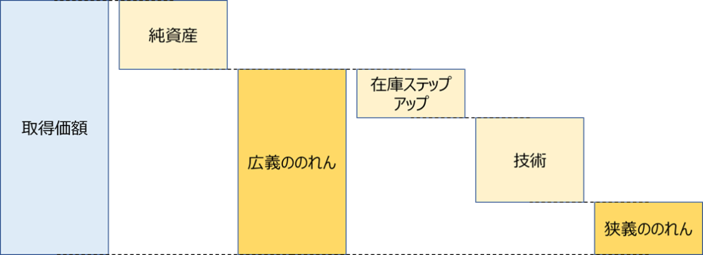 この広義ののれんから在庫ステップアップ分と技術(無形資産)を差し引いた残余部分、これが「狭義ののれん」になります。