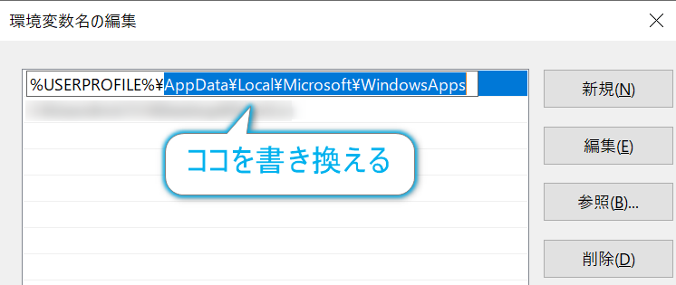 自身のユーザネーム以降のパスを、「ステップ1」で作成した任意名のフォルダを指定するように書き換えます。