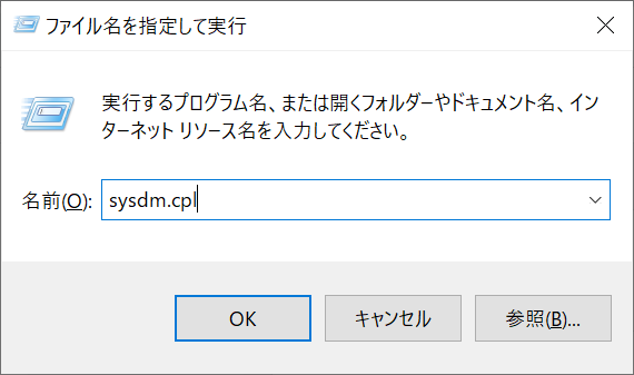 ②「sysdm.cpl」と入力し、Enterキーを押下