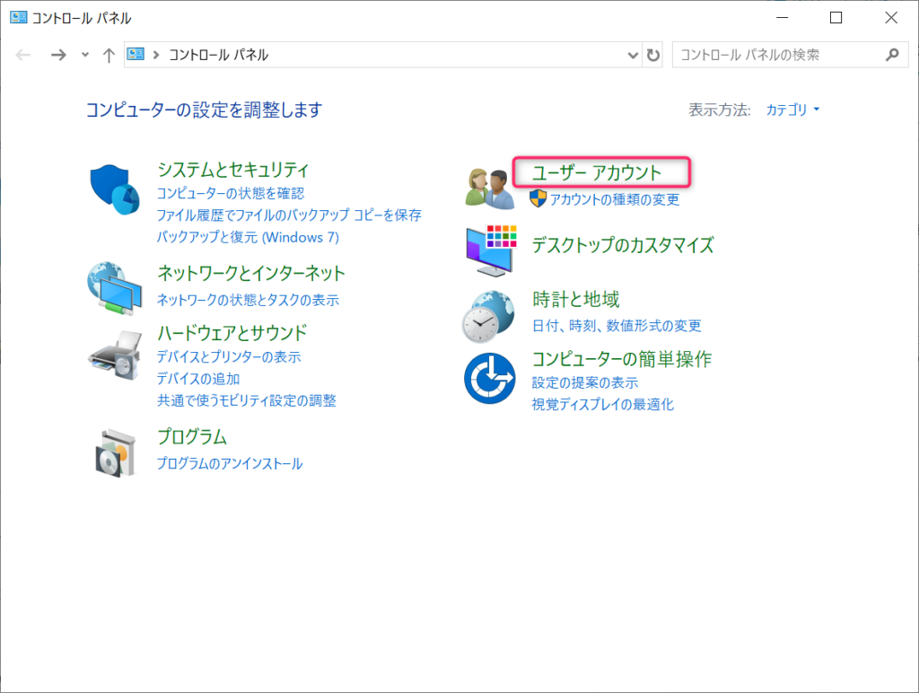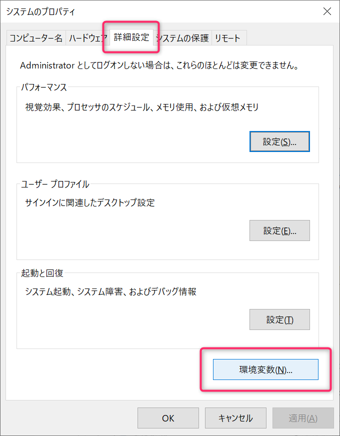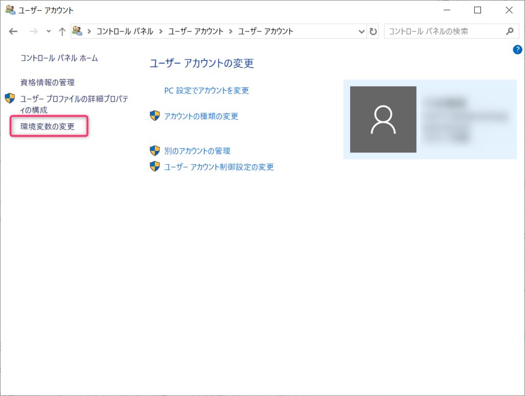 ③「ユーザーアカウント」⇒「ユーザーアカウント」⇒「環境変数の変更」の順に押下