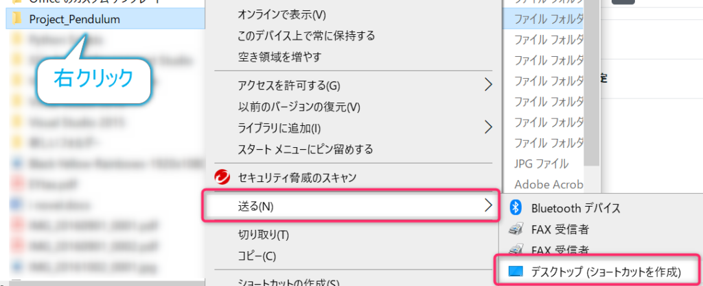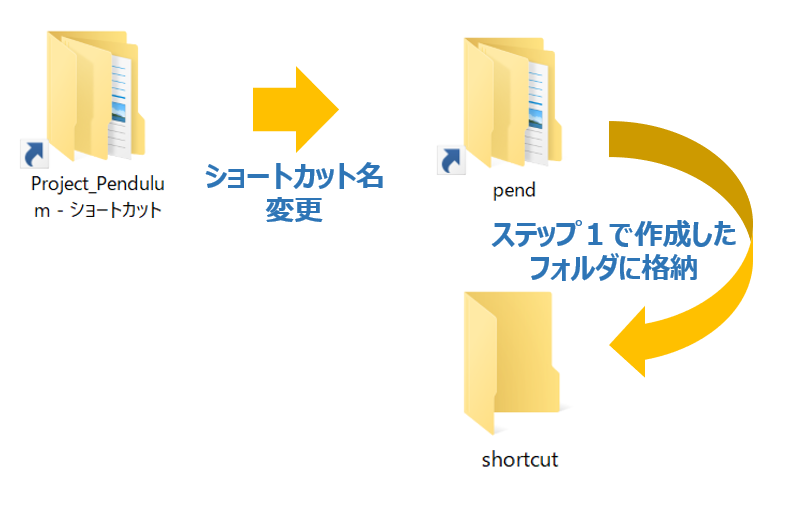 例えば、プロジェクト「Pendulum」のフォルダ「Project_Pendulum」のショートカットを作成した場合、入力しやすい「pend」に書き換えた上で「shortcut」フォルダに格納します。