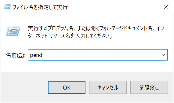 「Windows + R」を押下して「pend」を指定して実行すると、、、