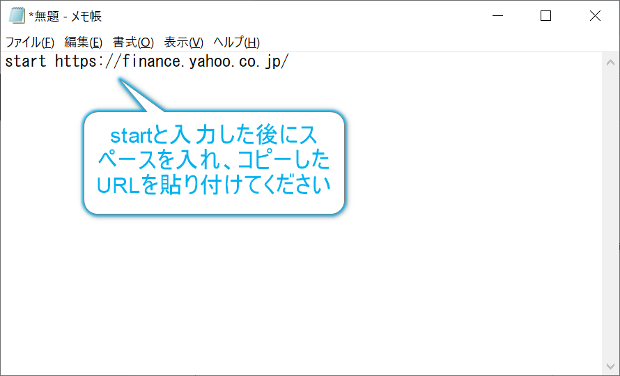 「Windows + R」を押下後、「notepad」と入力して実行してください。メモ帳が開いたら、「Start URL名」を入力(URL名:上でコピーしたURLを貼り付け)し、名前を付けて保存してください。名前は好きな名前で結構です。