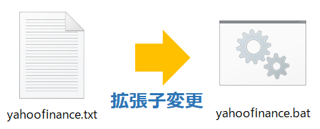 例では「yahoofinance」という名前で保存しました。このメモ帳の拡張子を「txt」から「bat」に変更します。警告が出ますが構わず実行してください。