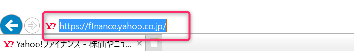 インターネットを立ち上げて「Yahooファイナンス」で検索し、ページをクリックしてください。ページが表示されたら上に表示されているURLをコピーしておきます。